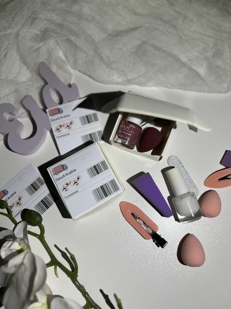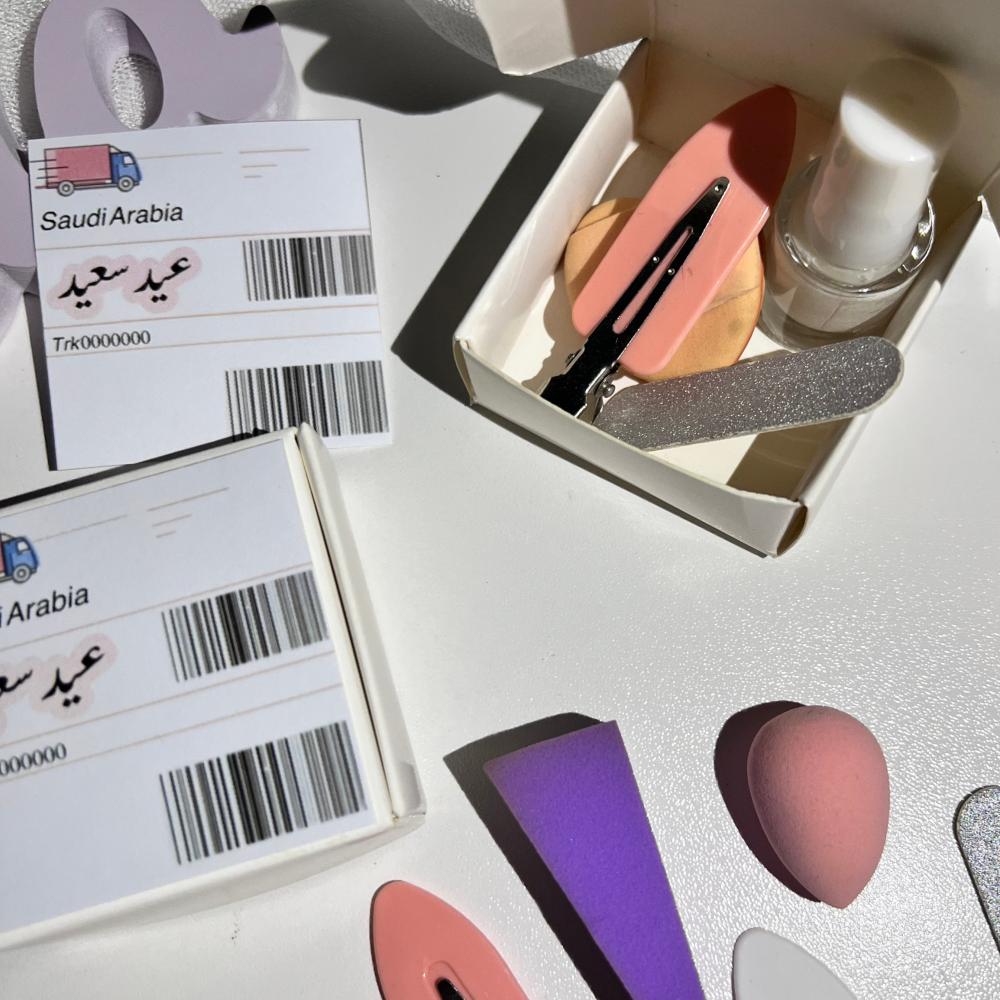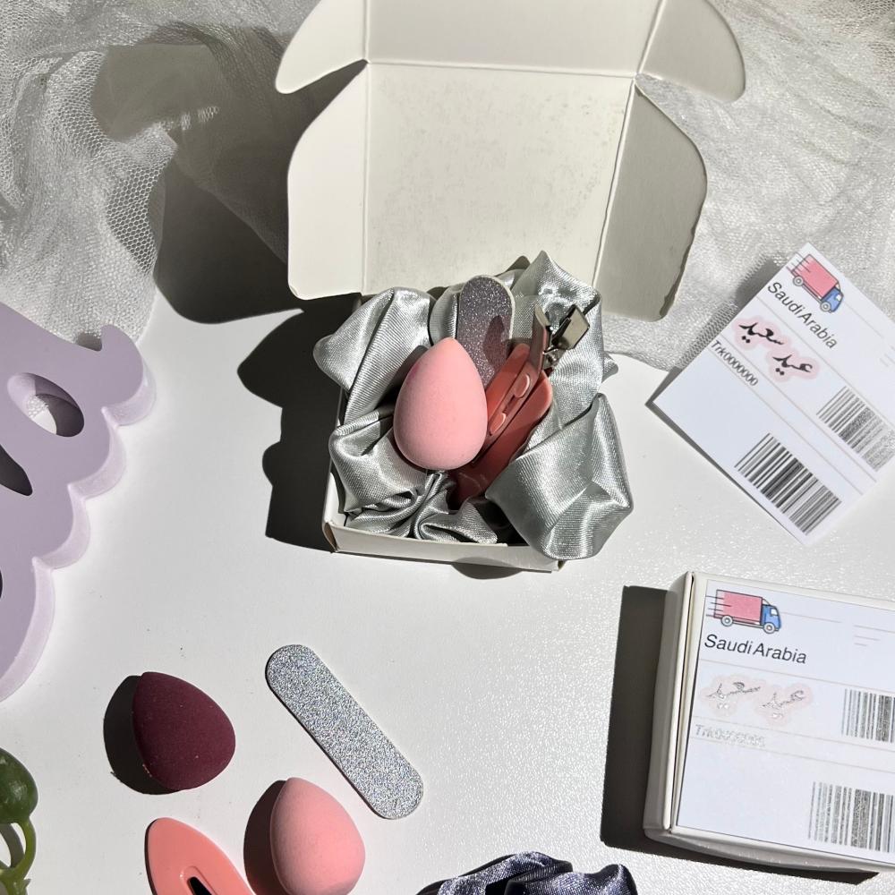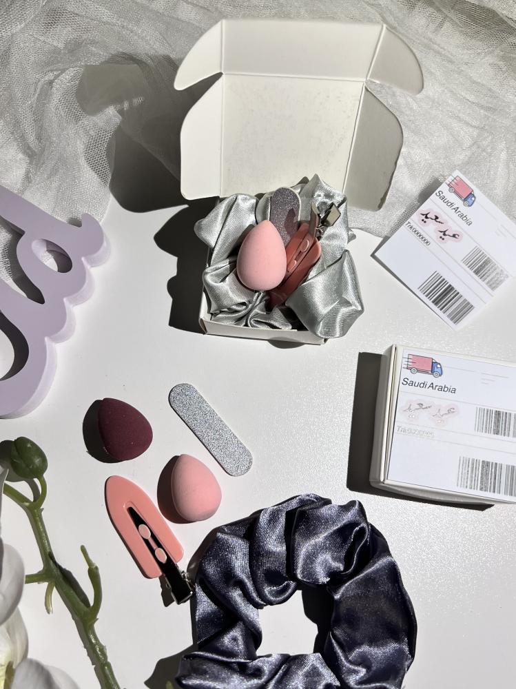 البوكس الاول ( مناكير+ اسفنجة ميكب + مبرد اظافر +شباصه شعر )
