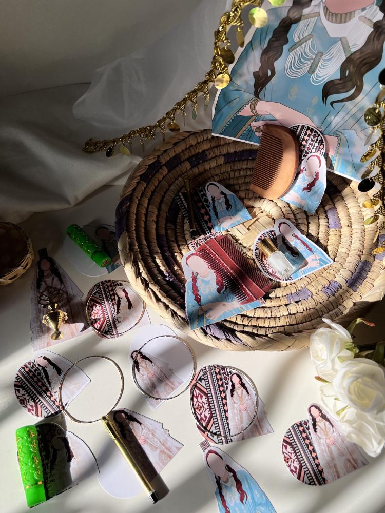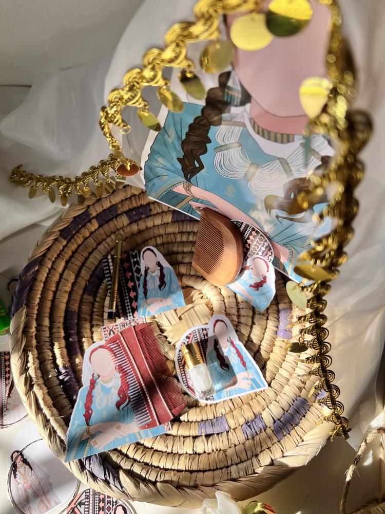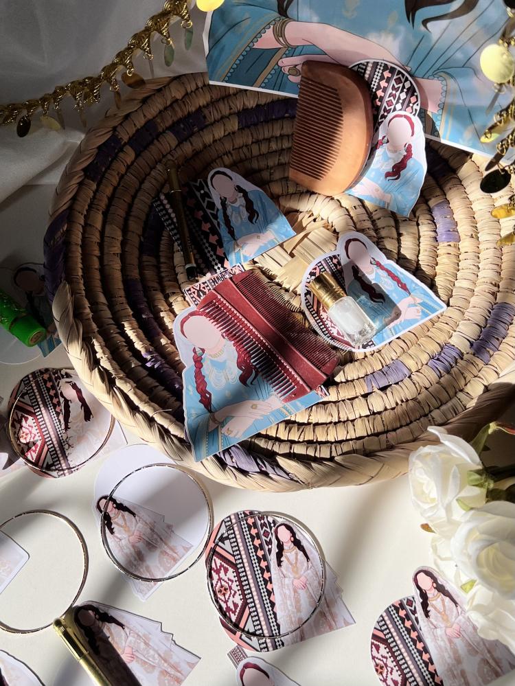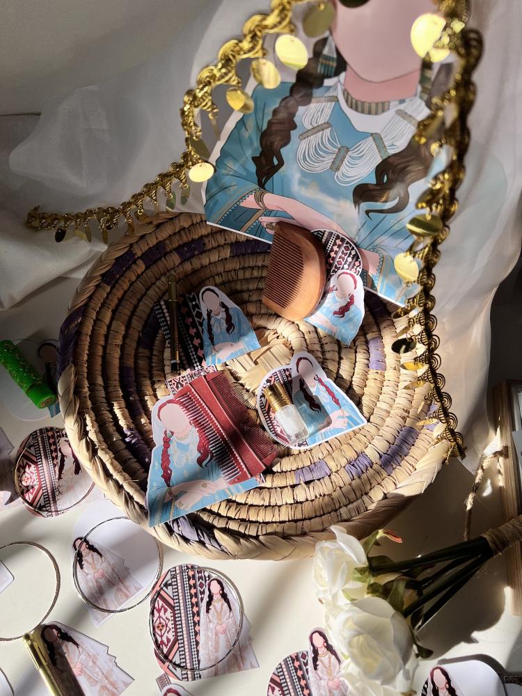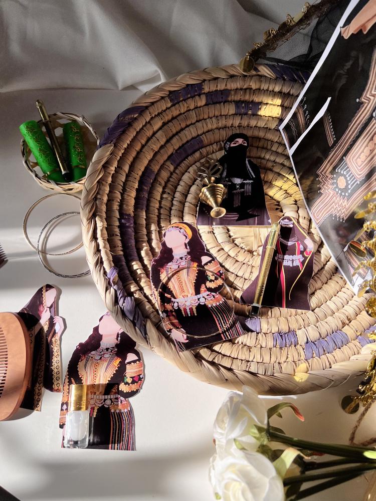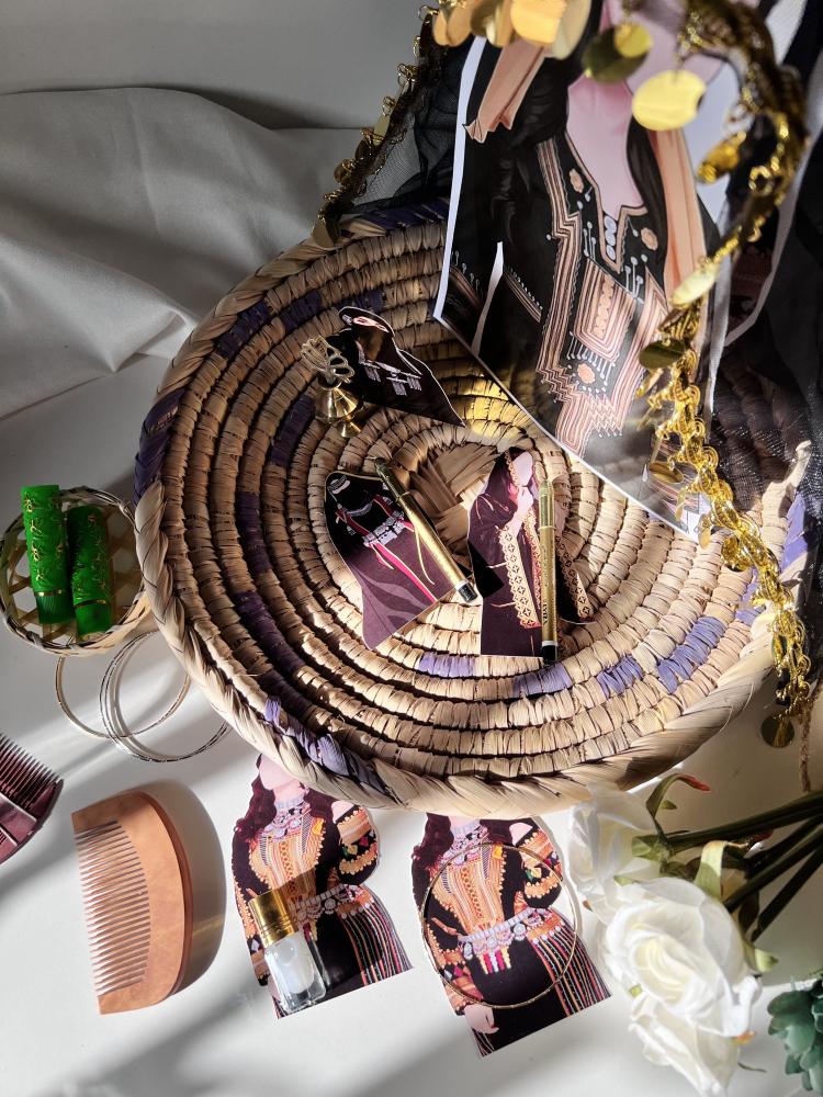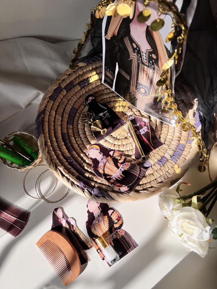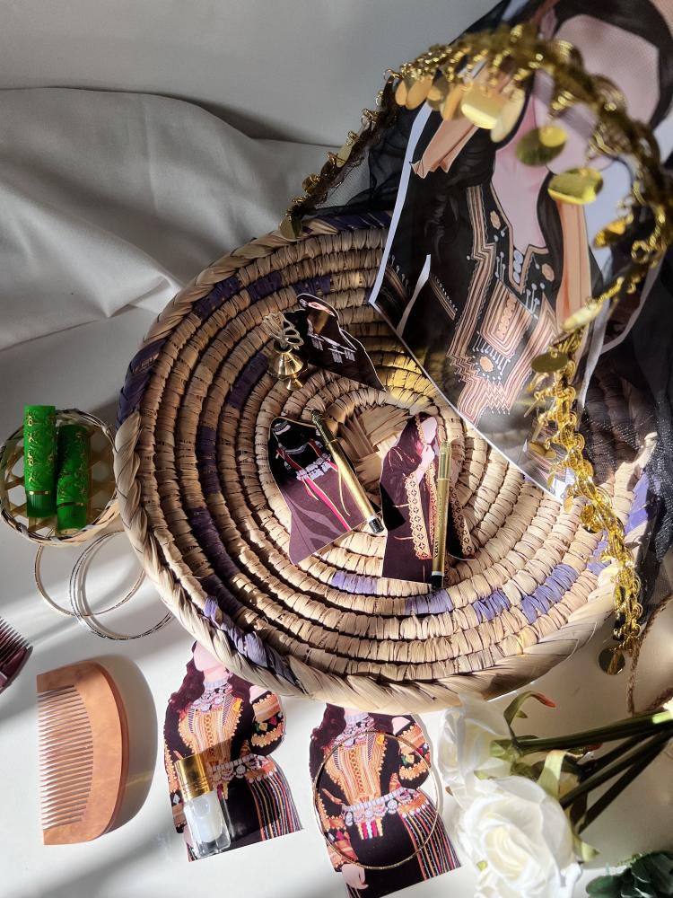 سله مع ثيم شعبي وقماش مزين بحلقات ذهبية
