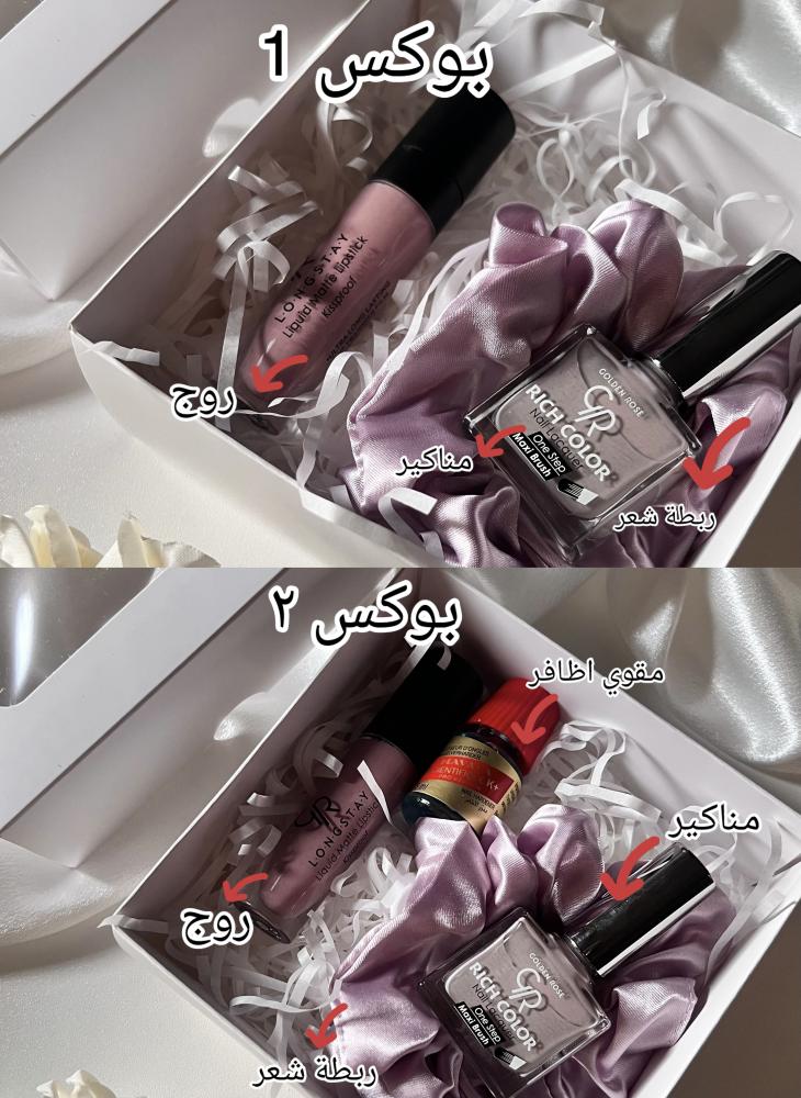 يحتوي على بوكس ابيض بغطاء شفاف بوكس 1 : مناكير جولدن روز روج جولدن روز ربطه شعر آللون عشوائيبوكس 2 يحتوي على : مناكير جولدن روز روج جولدن روز مقوي اظافر من مافلاربطه شعر آللون عشوائي